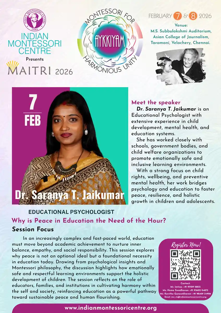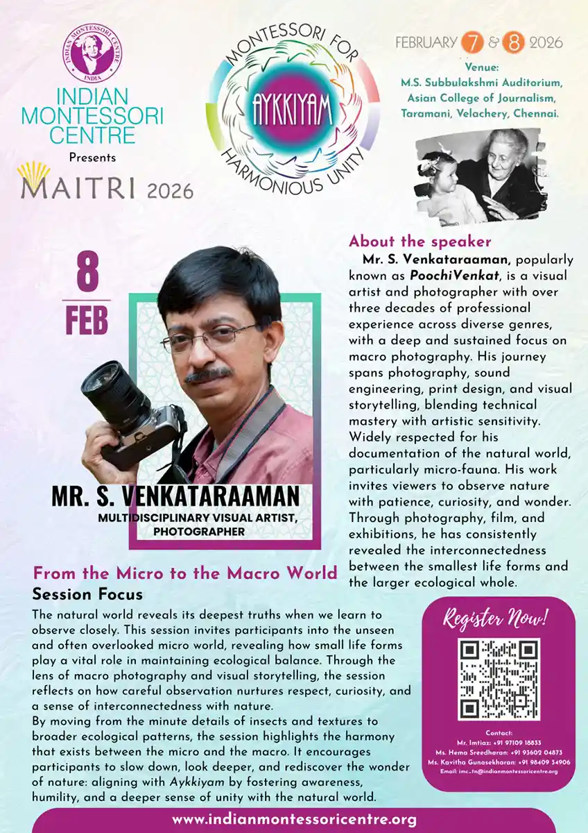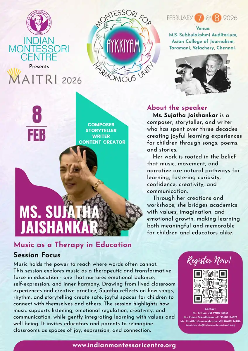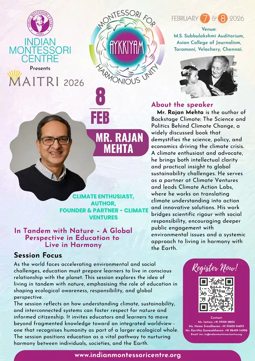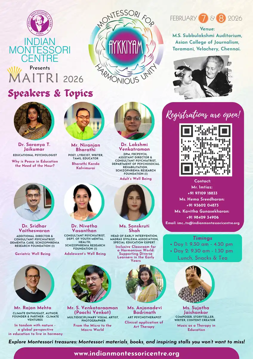 The Indian Montessori Centre has been organizin conferences and gatherings for the past many years for fellowship and professional development of educators, be they teachers, trainers, heads of schools, alumni or parents. It is a time to come together as a group to share, learn and synchronise one’s thoughts and actions in the journey of child development by anyone who is invested in the trueservice of mankind and nature.